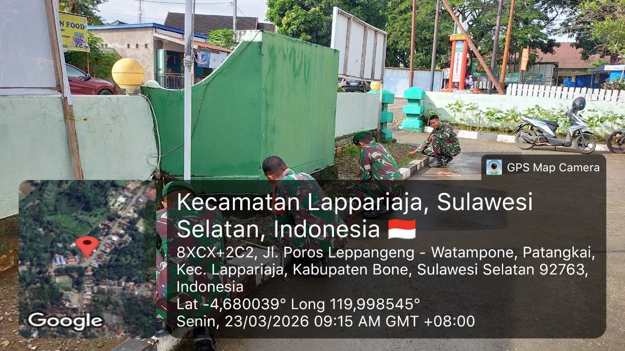 BONE – Babinsa Koramil 1407-09/Lapri melaksanakan pembenahan pangkalan di seputaran kantor Koramil yang terletak di Desa Patangkai, Kec. Lapri, Kab. Bone. Senin Siang (23/03/26).
