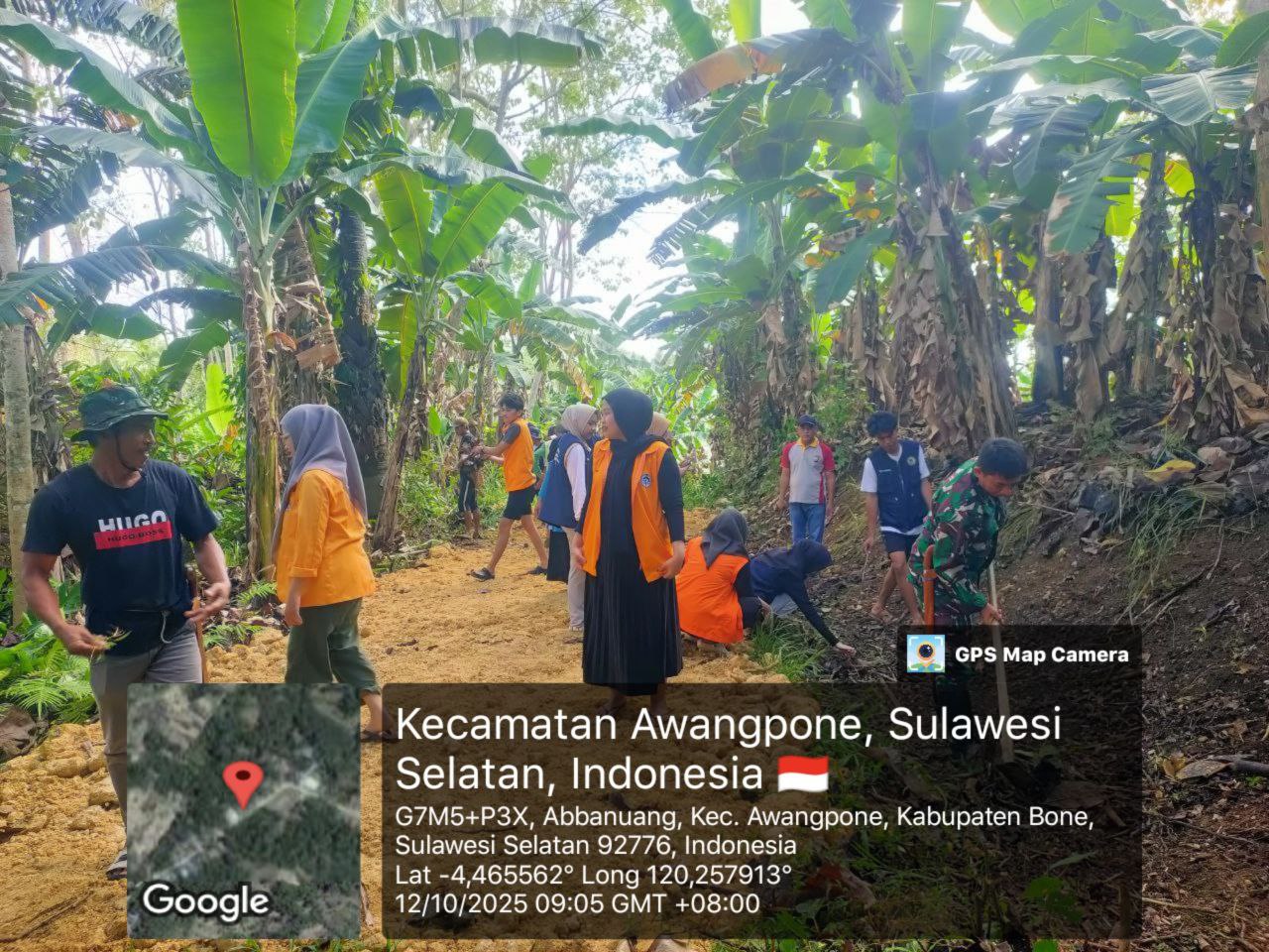 BONE – Babinsa Koramil 1407-06/Awangpone bersama mahasiswa Kuliah Kerja Nyata (KKN) Universitas Negeri Makassar (UNM) melaksanakan kegiatan gotong royong membersihkan jalan dan saluran air di wilayah Dusun Tana Cellae, Kecamatan Awangpone, Kabupaten Bone. Minggu siang (12/10/2025).