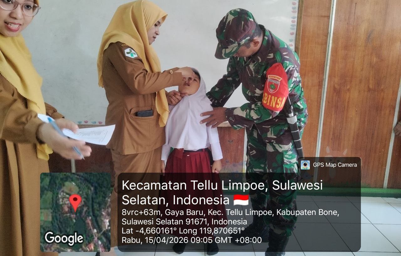 Bone – Sertu Muhammad Hasan Babinsa Koramil 1407-08/Lamuru dampingi vaksinasi polio bagi anak-anak Taman Kanak-kanak (TK) dan Sekolah Dasar (SD) di Desa Gaya Baru, Kec. Lamuru, Kab. Bone. Rabu siang (15/04/26).