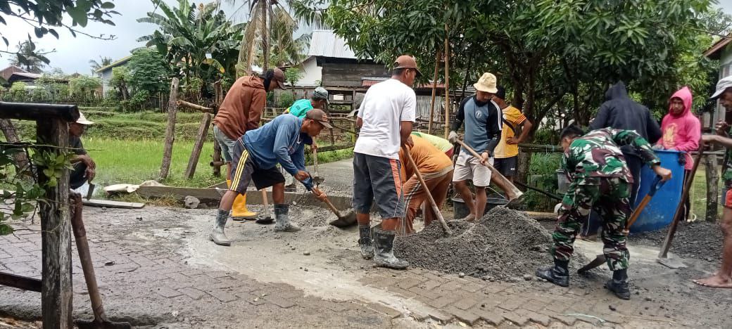 Jalan yang sebelumnya rusak dan sulit dilalui, kini mulai diperbaiki melalui pengecoran secara swadaya oleh warga dengan pendampingan langsung dari Babinsa.