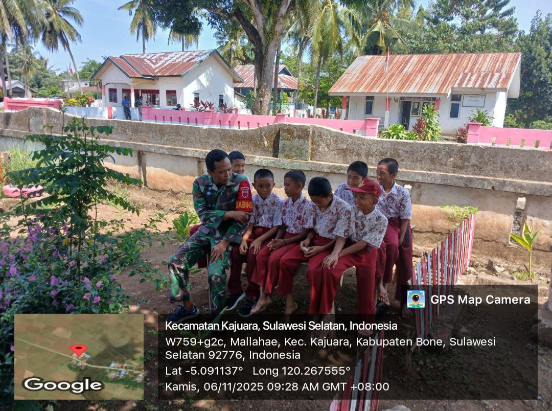 BONE – Tumbuhkan rasa cinta tanah air sejak dini, Babinsa Koramil 1407-18/Kajuara Kopda Andi Faharuddin melaksanakan Komunikasi Sosial (Komsos) sembari menyampaikan pembinaan wawasan kebangsaan kepada para siswa SDN 268 Mallahae, Kecamatan Kajuara, Kabupaten Bone, Kamis siang (06/11/2025).