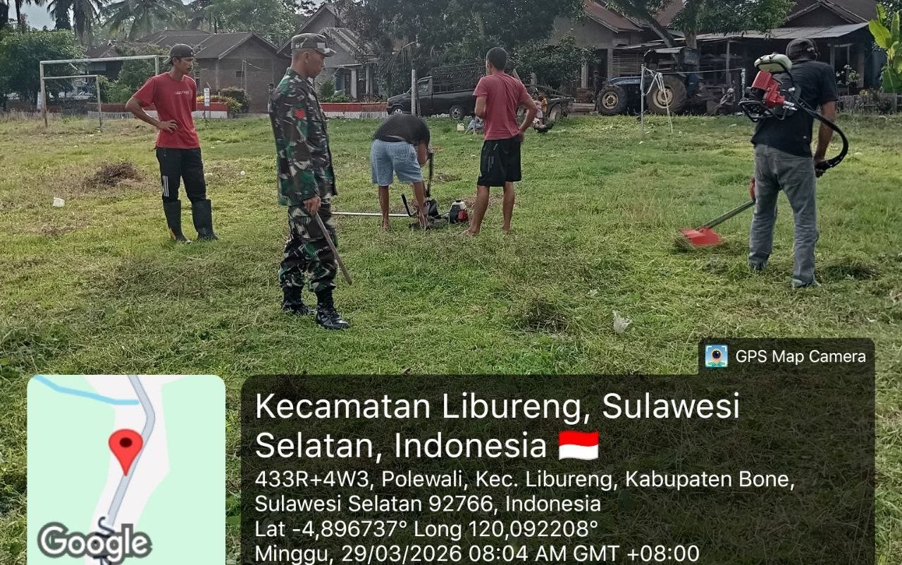 Bone – Kopka Muslim, Babinsa Koramil 1407-14/Libureng, bersama warga setempat melaksanakan kerja bakti pembersihan di lapangan Desa Polewali, Kecamatan Libureng, Kabupaten Bone, Minggu siang (29/03/2026).