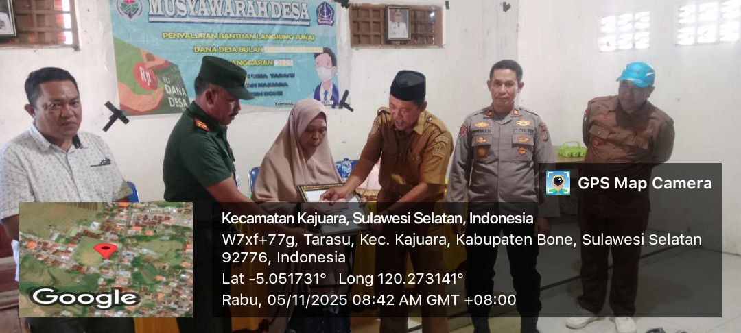 BONE – Komandan Koramil (Danramil) 1407-18/Kajuara, Lettu Inf. Syahruddin, menghadiri kegiatan penyaluran Bantuan Langsung Tunai (BLT) di Desa Tarasu, Kecamatan Kajuara, Kabupaten Bone, Rabu siang (05/11/25).