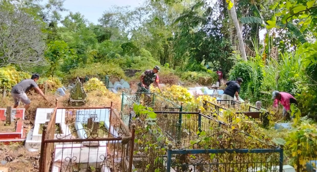 Dalam kegiatan itu, Koptu Abdul Rahman bersama warga setempat bergotong royong membersihkan rumput liar, semak belukar, serta merapikan lingkungan di sekitar area pemakaman agar terlihat lebih bersih dan tertata.