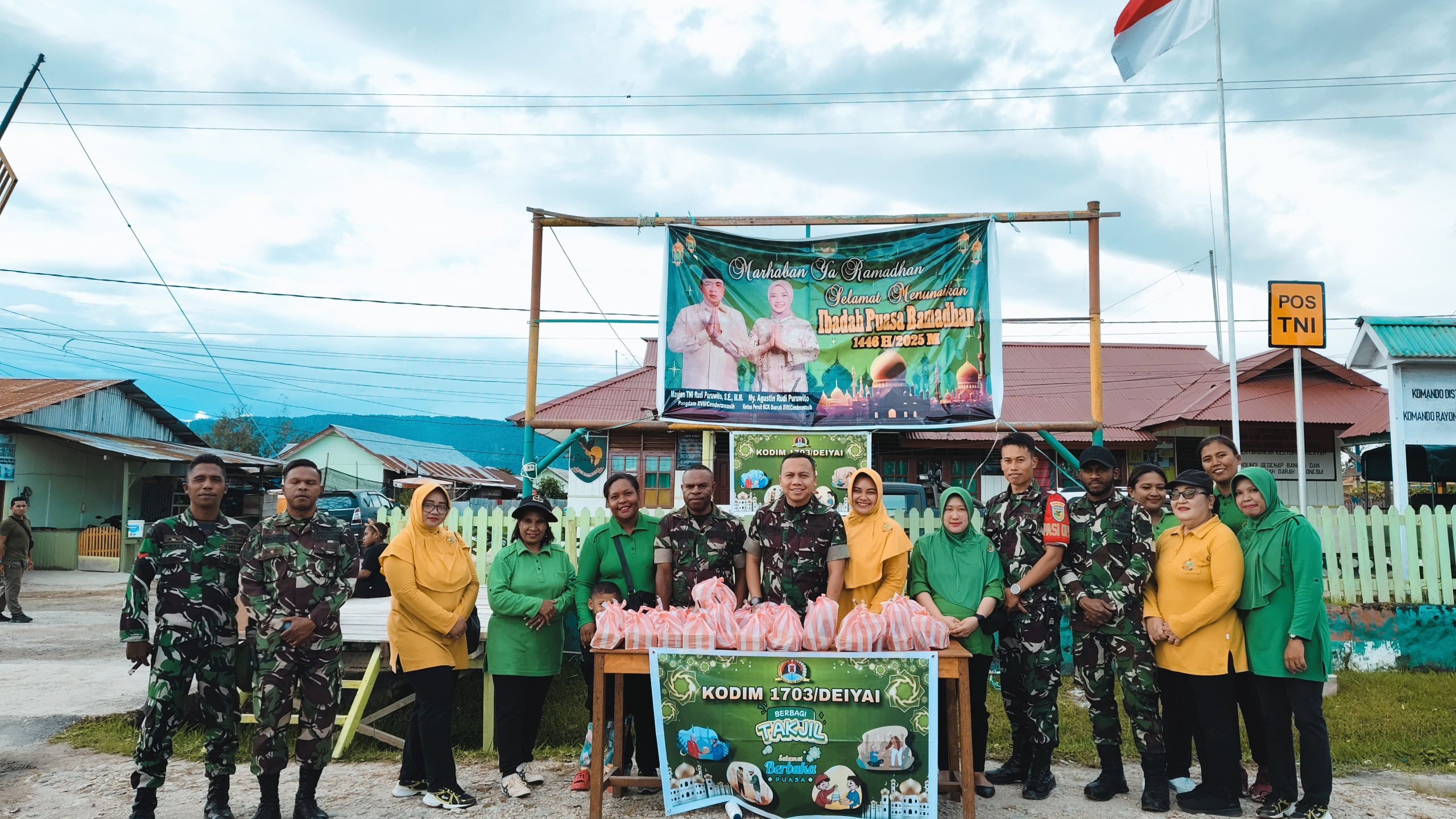 Komandan Kodim 1703/Deiyai Letkol Inf Ari Iswoyo Timor, S.hub, Int bersama ketua Persit dan anggota persit Kartika Chandra Kirana (KCK) Cabang XXXll Dim 1703/Deiyai Ny. Ila Ari Iswoyo Timor turun langsung memimpin kegiatan berbagi takjil dan ini adalah pembagian takjil yang ke tiga kalinya Jumat, (28/03/2025).