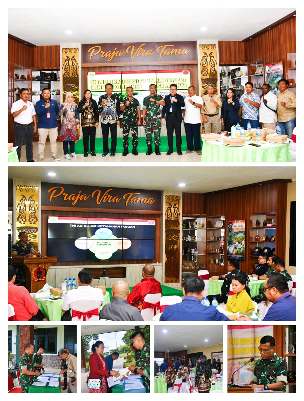 Kasilog Kasrem 181/PVT Kolonel Cba Haris Kusdrayanto membacakan amanat Komandan Korem 181/PVT yang dalam sambutannya mengucapkan terima kasih kepada para undangan yang telah meluangkan waktu untuk menghadiri kegiatan pada hari ini. Pada kesempatan yang baik ini kiranya dapat kita manfaatkan untuk meningkatkan kebersamaan dan membangun komunikasi dialogis diantara kita, sehingga diharapkan akan terwujud kesamaan pandangan dalam menyikapi berbagai permasalahan aktual di Provinsi Papua Barat Daya, khususnya di wilayah Sorong Raya,” ujarnya.