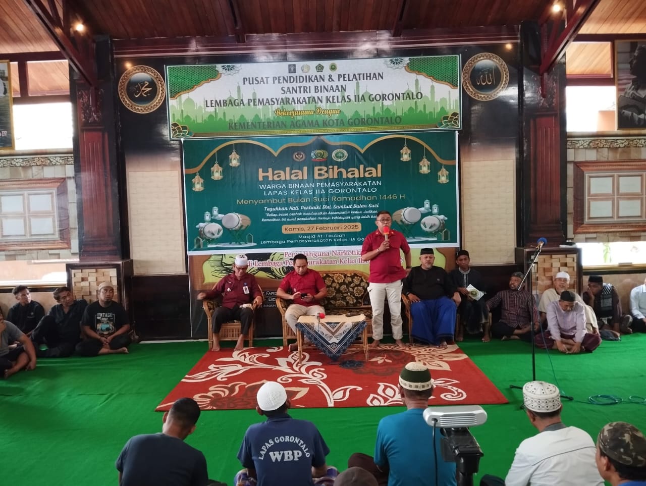 Gorontalo – Menyambut bulan suci Ramadhan 1446 H, Lembaga Pemasyarakatan (Lapas) Kelas IIA Gorontalo menggelar kegiatan Halal Bihalal bagi warga binaan pemasyarakatan. Kegiatan ini dihadiri oleh Ka.binadik, Kasdin Lato, Ketua Umum Badan Ta’mirul Masjid yang juga menjabat sebagai Kasubsibimkemaswat, Rusli Usman, serta KPLP, Yarham Pantu.