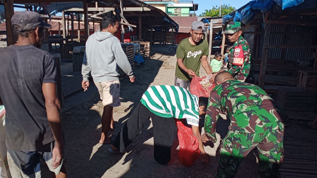 Kegiatan aksi bersih-bersih pasar tersebut dipimpin oleh Babinsa Sertu Mahmud dibantu rekanya dari Koramil 03/Tamalatea bersama warga masyarakat sekitar.