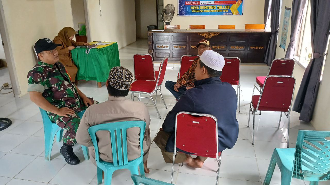 BONE – Babinsa Koramil 1407-05/Ulaweng Serda Syuryanto Syarifuddin melaksanakan komunikasi sosial (Komsos) bersama aparat desa dan sebagian warga di Desa Benteng Tellue, Kec. Amali, Kab. Bone. Jumat (13/03/26).