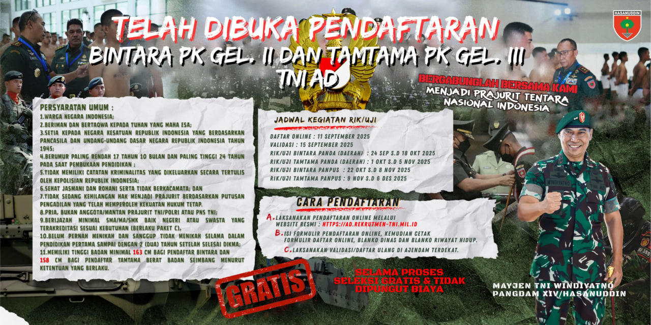 Kepala Dinas Penerangan Angkatan Darat (Kadispenad), Brigjen TNI Wahyu Yudhayana, S.E., M.M., menyampaikan bahwa rekrutmen tahun ini dibuka untuk putra-putri Warga Negara Indonesia dengan kualifikasi kesehatan, jasmani, serta akademik yang telah ditetapkan. “Kami mengajak generasi muda untuk mendaftarkan diri melalui jalur resmi. TNI AD membuka kesempatan bagi mereka yang memiliki komitmen kuat membela bangsa dan negara,” ujarnya.