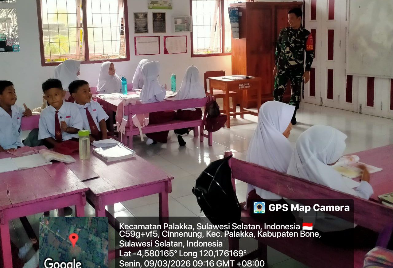 Bone – Babinsa Koramil 1407-21/Palakka Sertu Ikmal Malik melaksanakan Pembinaan Wawasan Kebangsaan kepada para siswa SD Inpres 12/79, yang berlokasi di Desa Cinennung, Kec. Palakka, Kab. Bone. Senin siang (09/03/26).
