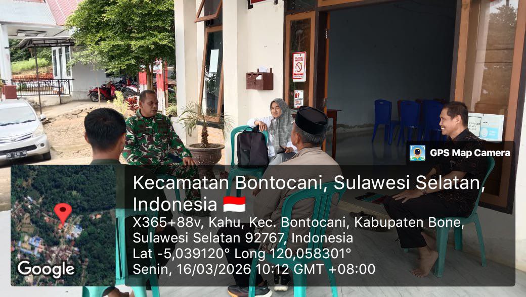 BONE – Ws. Danramil 1407-20/Bontocani Peltu Andi Raja Abdillah melaksanakan komunikasi sosial (komsos) bersama staf kecamatan di Kantor Kec. Bontocani, Kab. Bone. Senin Siang (16/03/26).