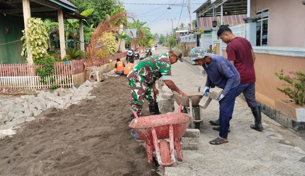 Selain membantu secara fisik, Babinsa juga memberikan arahan teknis ringan agar pemasangan paving blok lebih rapi dan tahan lama.