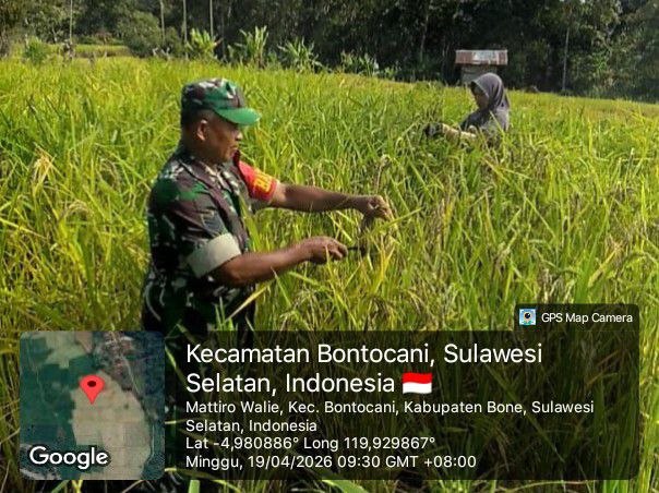 BONE – Babinsa Koramil 1407-20/Bontocani Serma Sudirman turun langsung membantu warga dalam kegiatan panen padi ketan hitam di Desa Mattirowalie, Kecamatan Bontocani, Kabupaten Bone. Minggu siang (19/04/26).